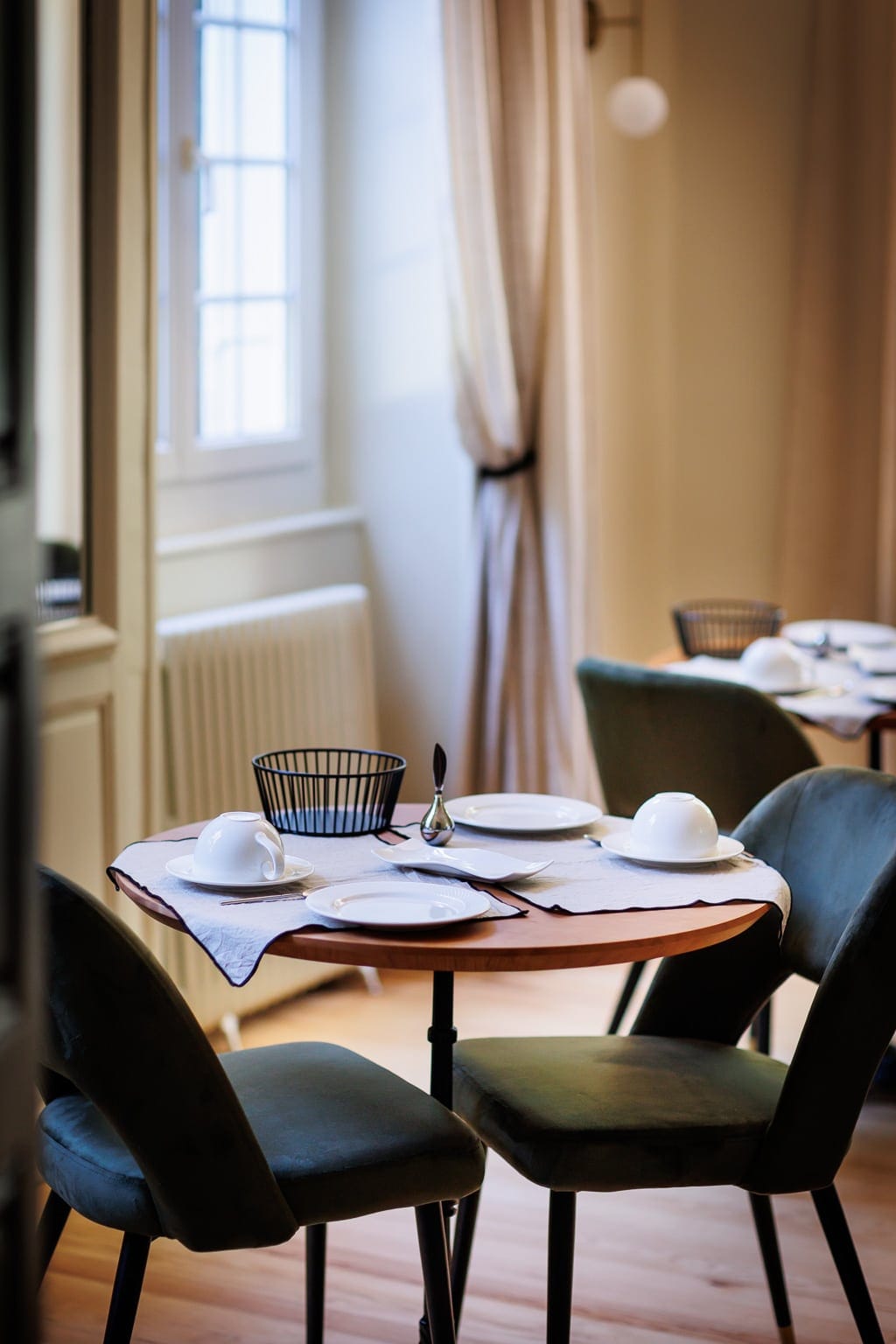 Le petit déjeuner vous sera servi dans la salle au rez-de-chaussée qui devait tenir lieu d’ancien salon de réception. Un style cossu, bourgeois, revisité dans un esprit contemporain jouant avec des tissus et couleurs propices à introduire une ambiance enveloppante très cocooning.